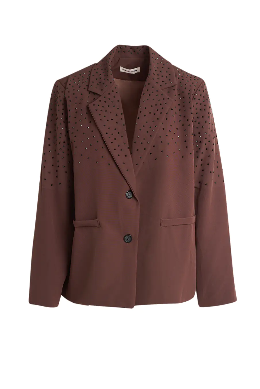 Blazer em tecido suave com detalhes de tachas nos ombros e lapela. Corte elegante e moderno.