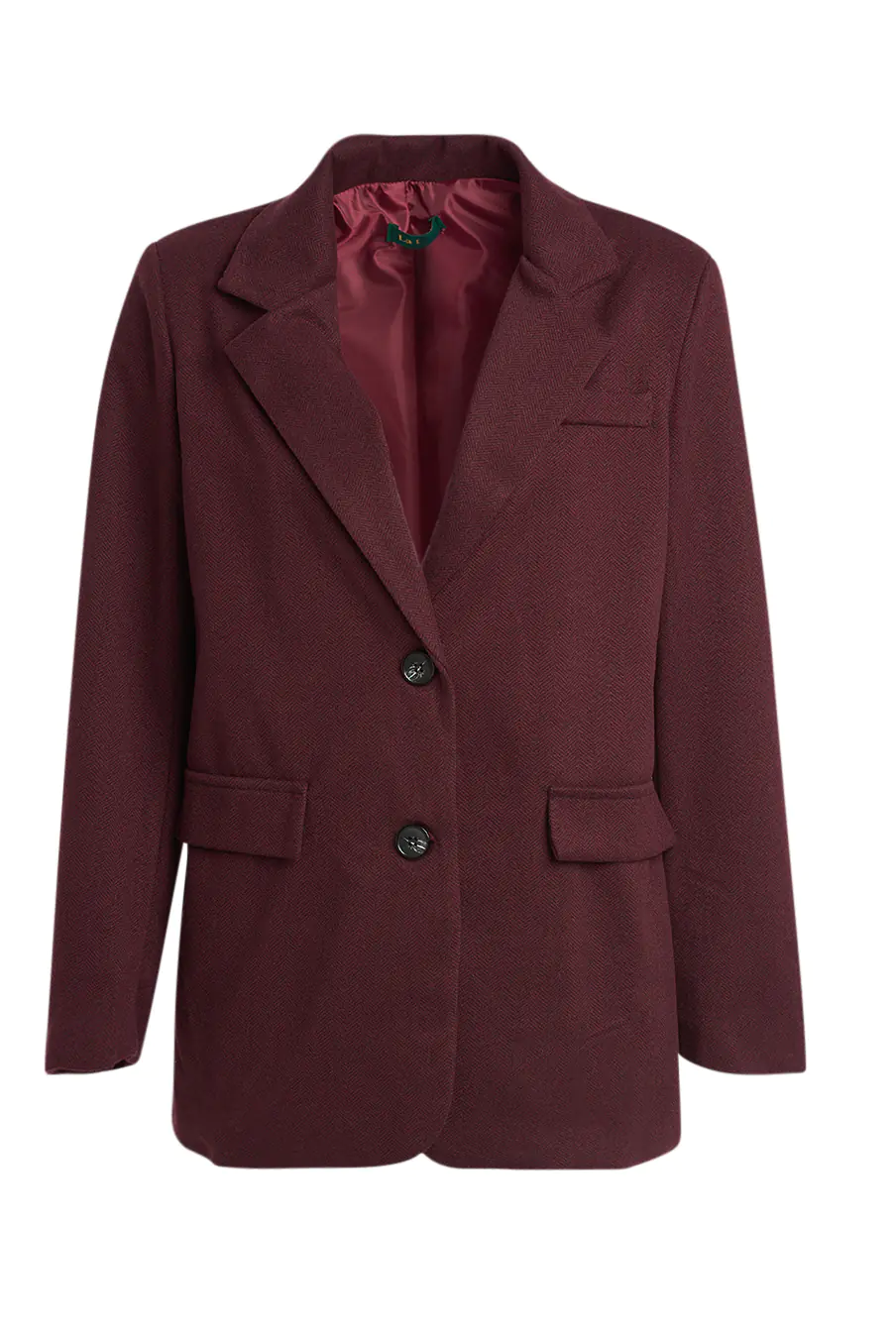 Blazer estruturado com lapela clássica e dois botões frontais. Tecido com padrão espinha de peixe e bolsos laterais.
