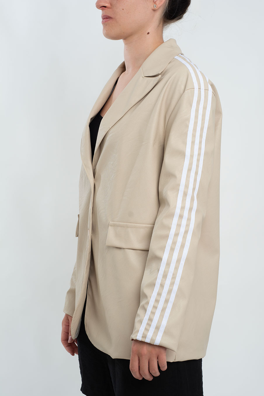 Blazer com modelagem reta e moderna, ele se destaca pelas riscas brancas desportivas ao longo das mangas, que conferem um toque despojado ao look.