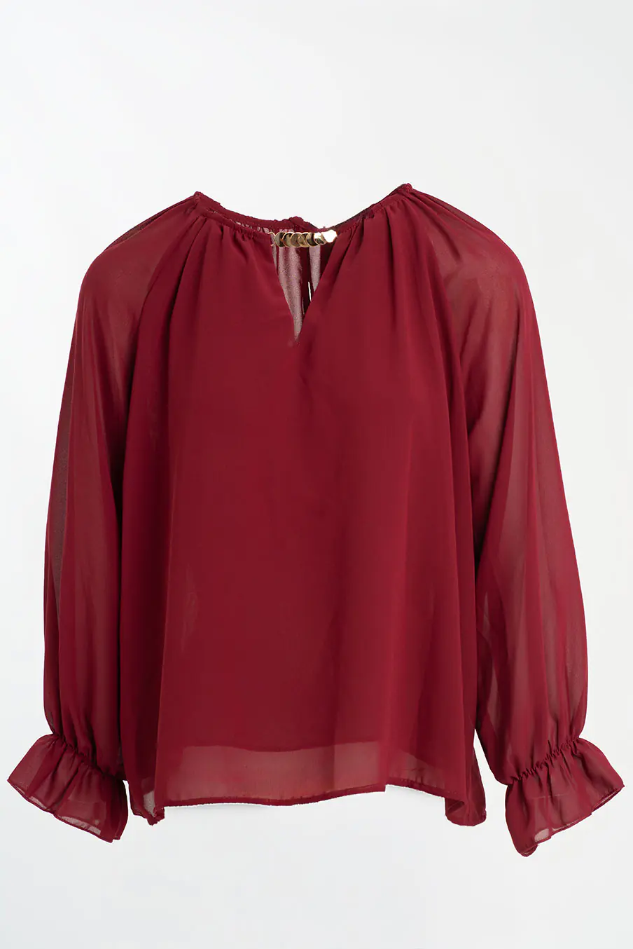 Blusa em chiffon elegante e de corte fluido, com detalhe em metal dourado