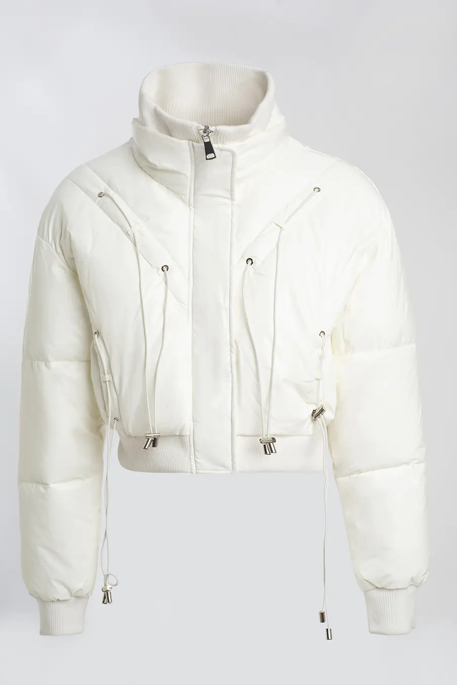 Quispo Puffer curto com gola alta em malha. Com cordões ajustáveis.
