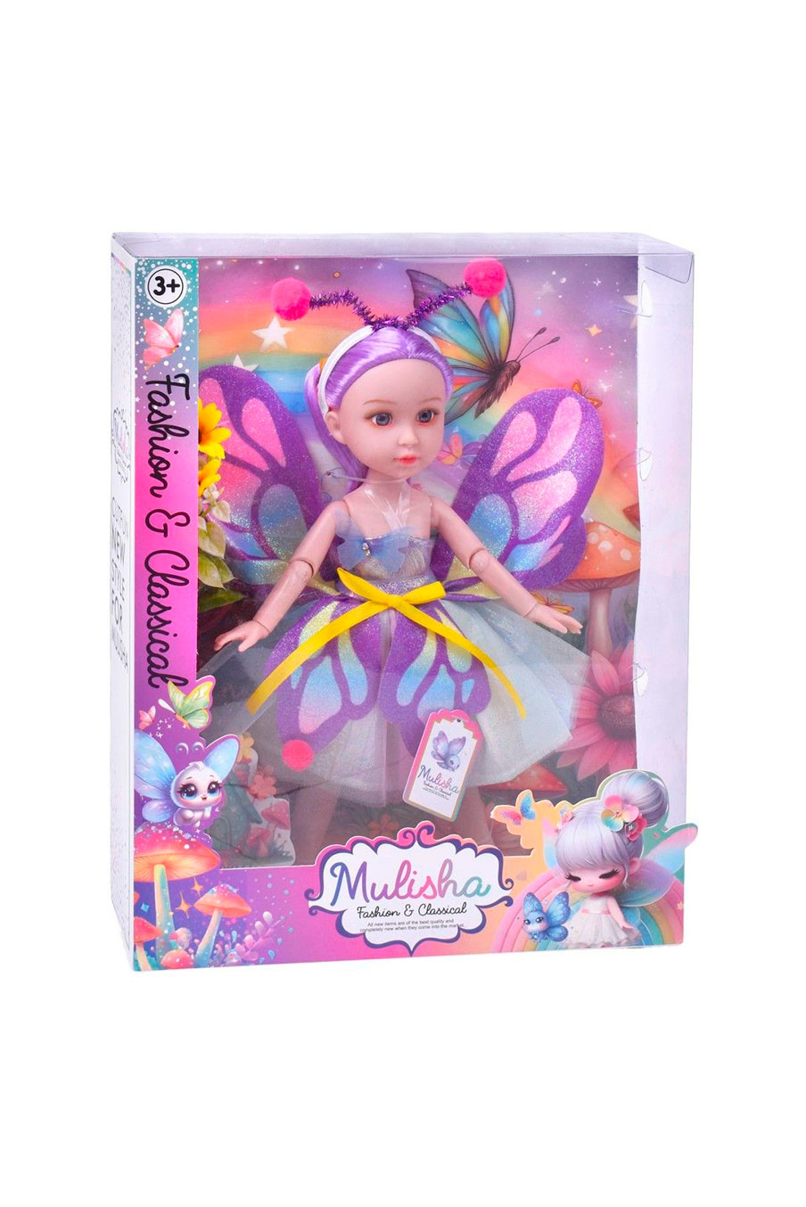 Boneca Mulisha Fairy — uma encantadora boneca fada com asas brilhantes e vestido cheio de glitter. Ideal para estimular a imaginação e recriar histórias mágicas de fantasia.
