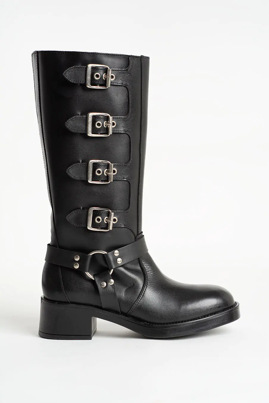 Bota preta com quatro fivelas prateadas ao longo do cano, inspirada em estilo gótico/motard. Com sola robusta e acabamento polido.
