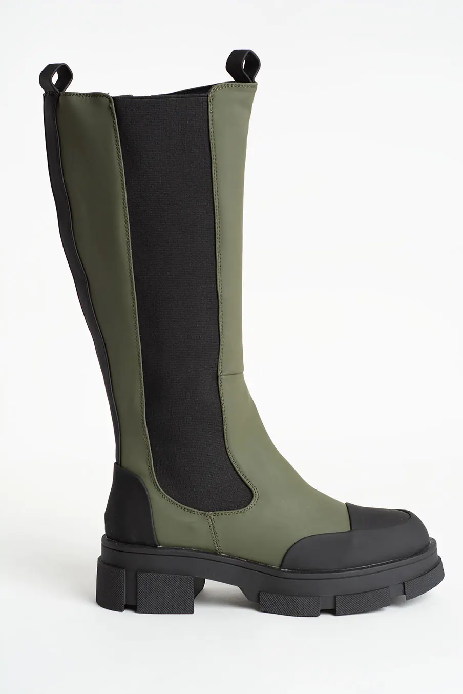 Bota verde-azeitona e preta, modelo tipo Chelsea de cano alto, com elástico lateral preto e sola grossa em preto. Design contemporâneo, contraste forte entre o verde e o preto, acabamento ligeiramente mate.