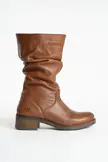 Bota em pele com cano médio e acabamento semi-brilhante. O material é liso e polido. Salto baixo em tom madeira.