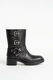 Bota preta com três fivelas prateadas e aro metálico central. Cano médio, sola grossa e design estruturado.