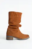 Bota em camurça com cano médio, efeito enrugado e sola de borracha castanha clara.
