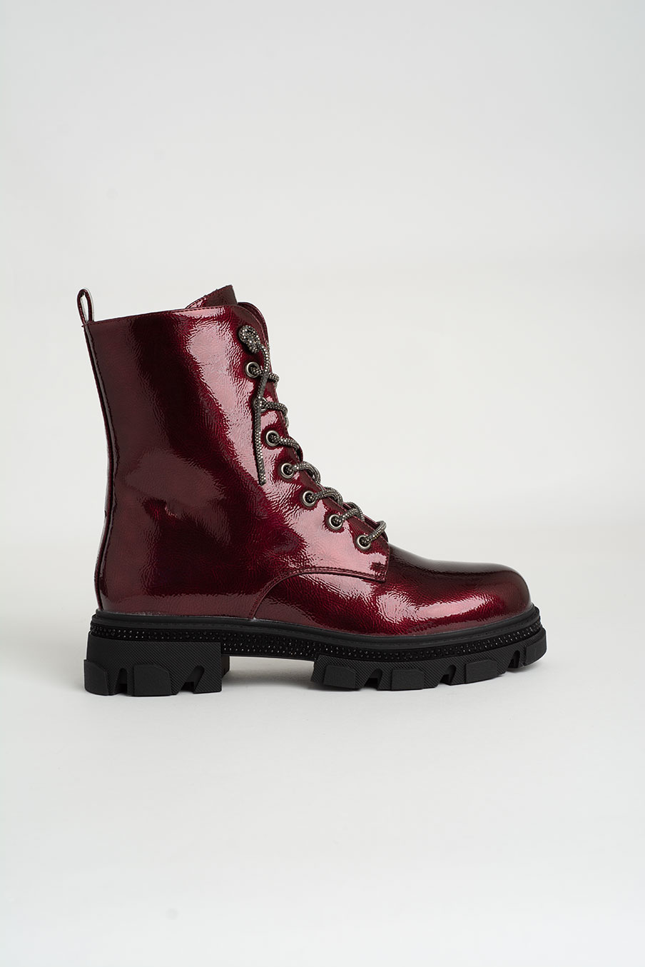 Bota de atacadores com acabamento brilhante e sola robusta, perfeita para quem procura estilo com um toque irreverente. O design combina inspiração militar com um visual moderno e urbano.