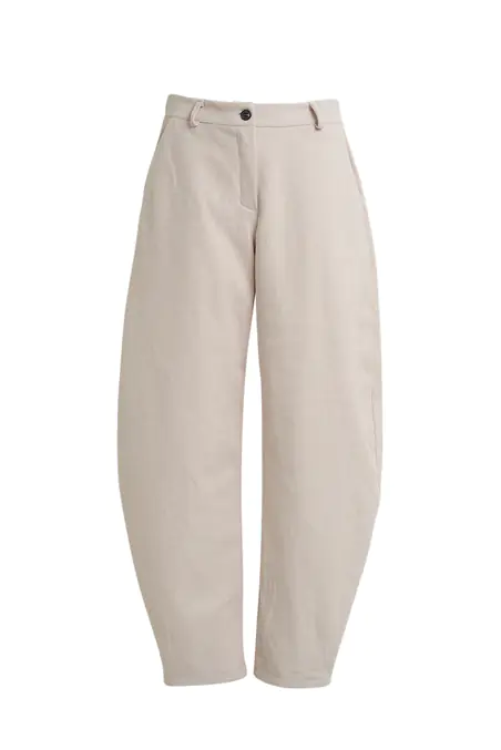 Calças em tecido estruturado, com pinças frontais e corte ballon.