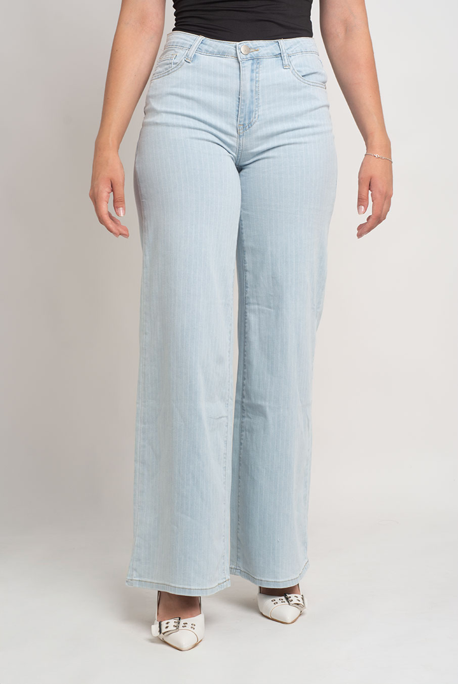 Calça wide leg com detalhe efeito riscas.