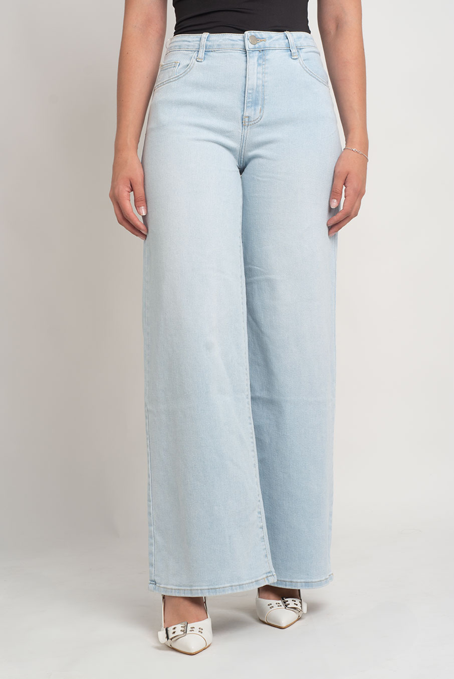Calça wide leg com elastano e cintura subida.