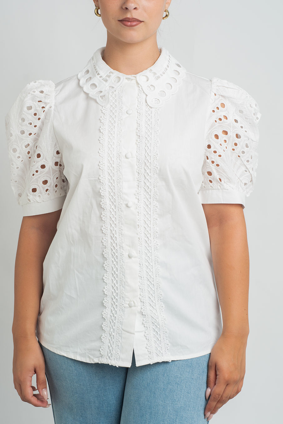 Ela traz delicados detalhes em renda nas mangas bufantes e no centro.