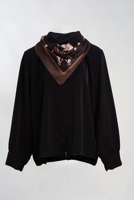 Camisa fluida com lenço estampado — um toque sofisticado e moderno num look clássico. Ideal para conjugar com calças de cintura subida ou saias midi e criar um visual elegante sem esforço.