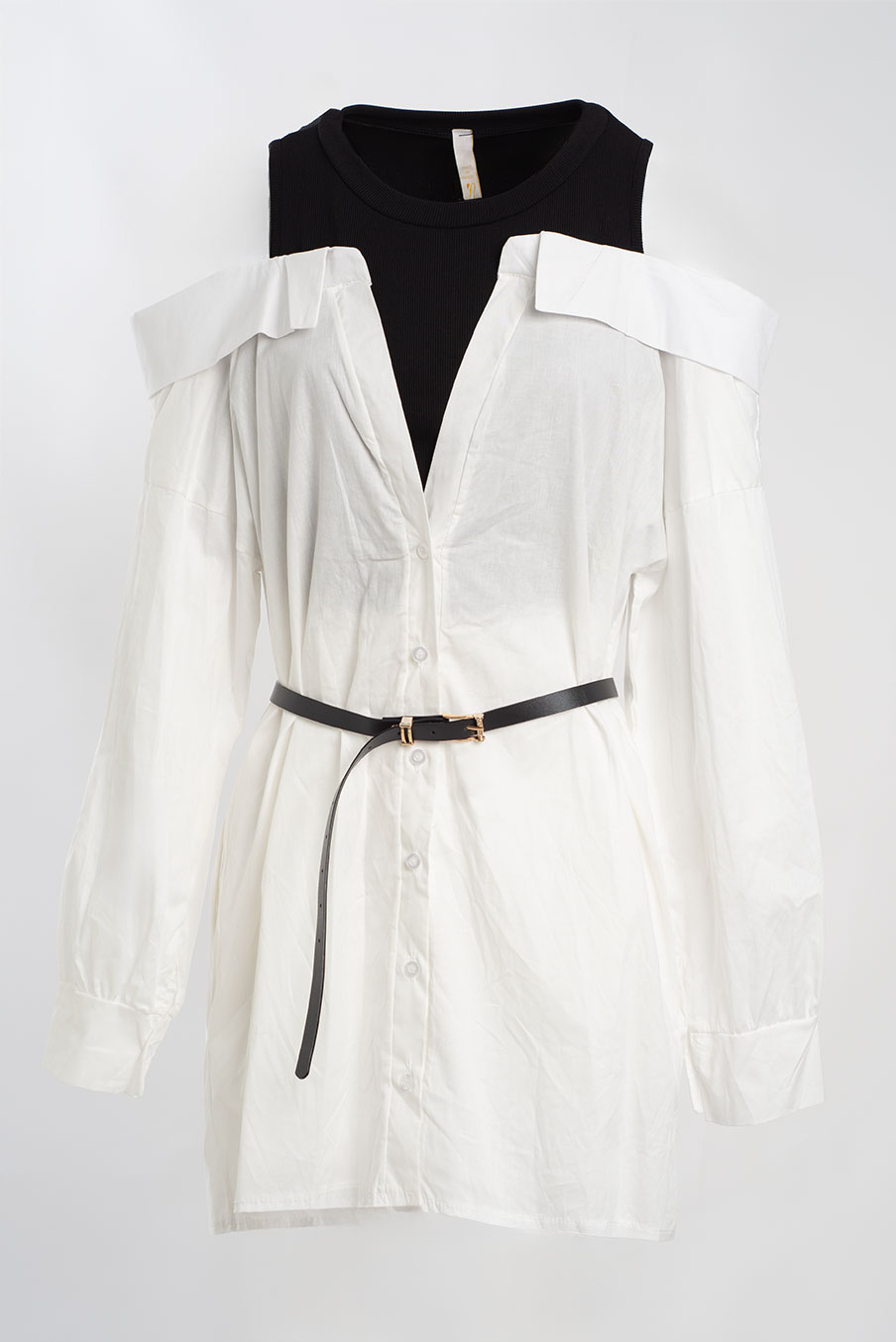 Camisa/ vestido com ombros descobertos e cinto fino — mistura perfeita entre o clássico e o moderno. Uma peça arrojada que valoriza a silhueta e transforma qualquer look num statement de estilo.
