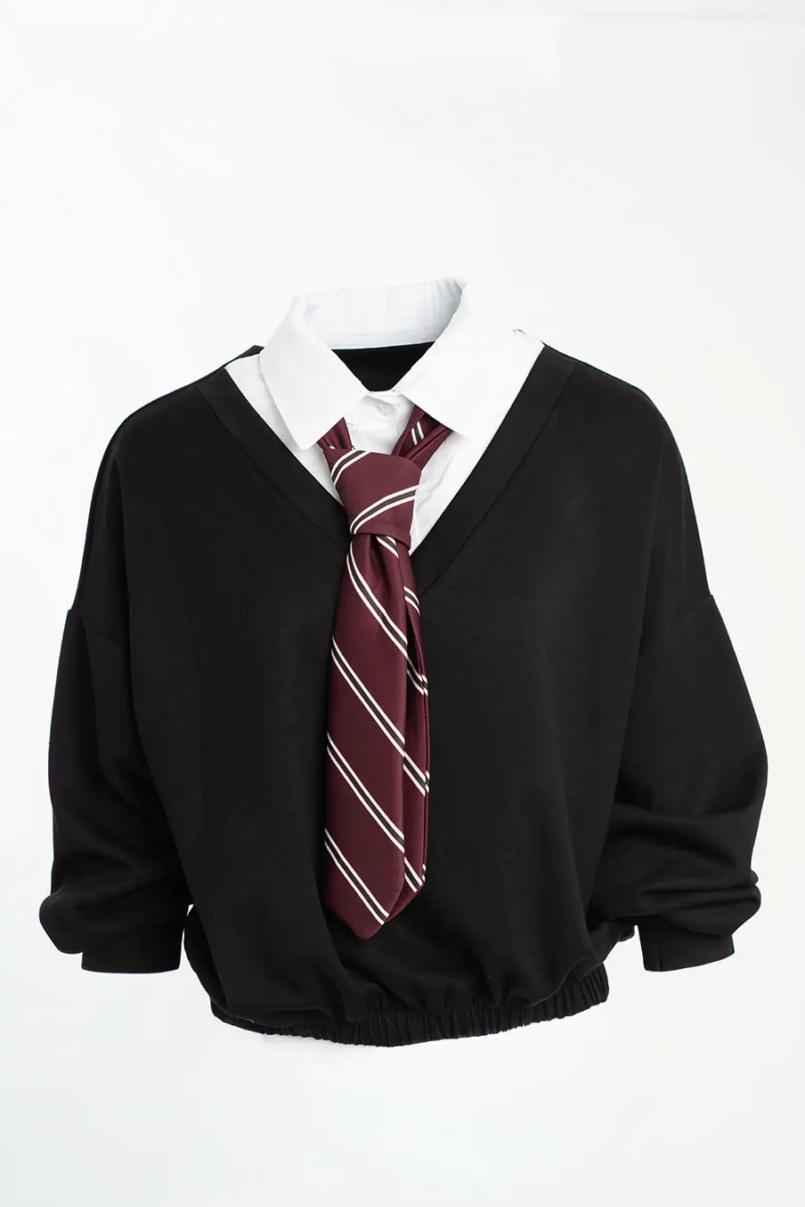 camisola estilo uniforme com colarinho de camisa branco e gravata incluida