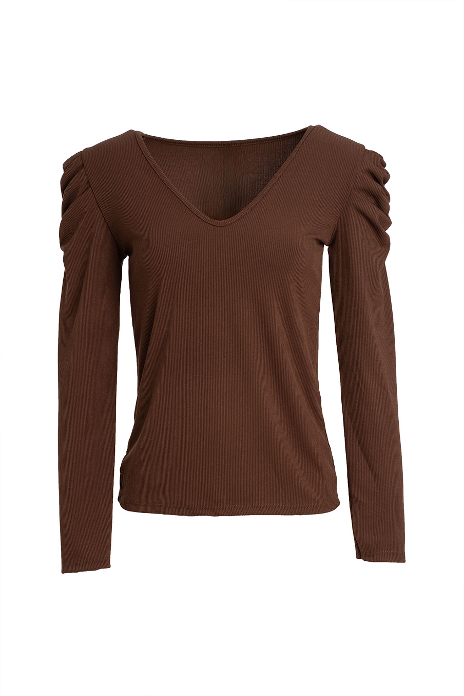Blusa de manga comprida com decote em V e detalhe franzido nos ombros — um toque feminino e elegante num corte simples e versátil. Ideal para looks casuais ou combinações mais sofisticadas