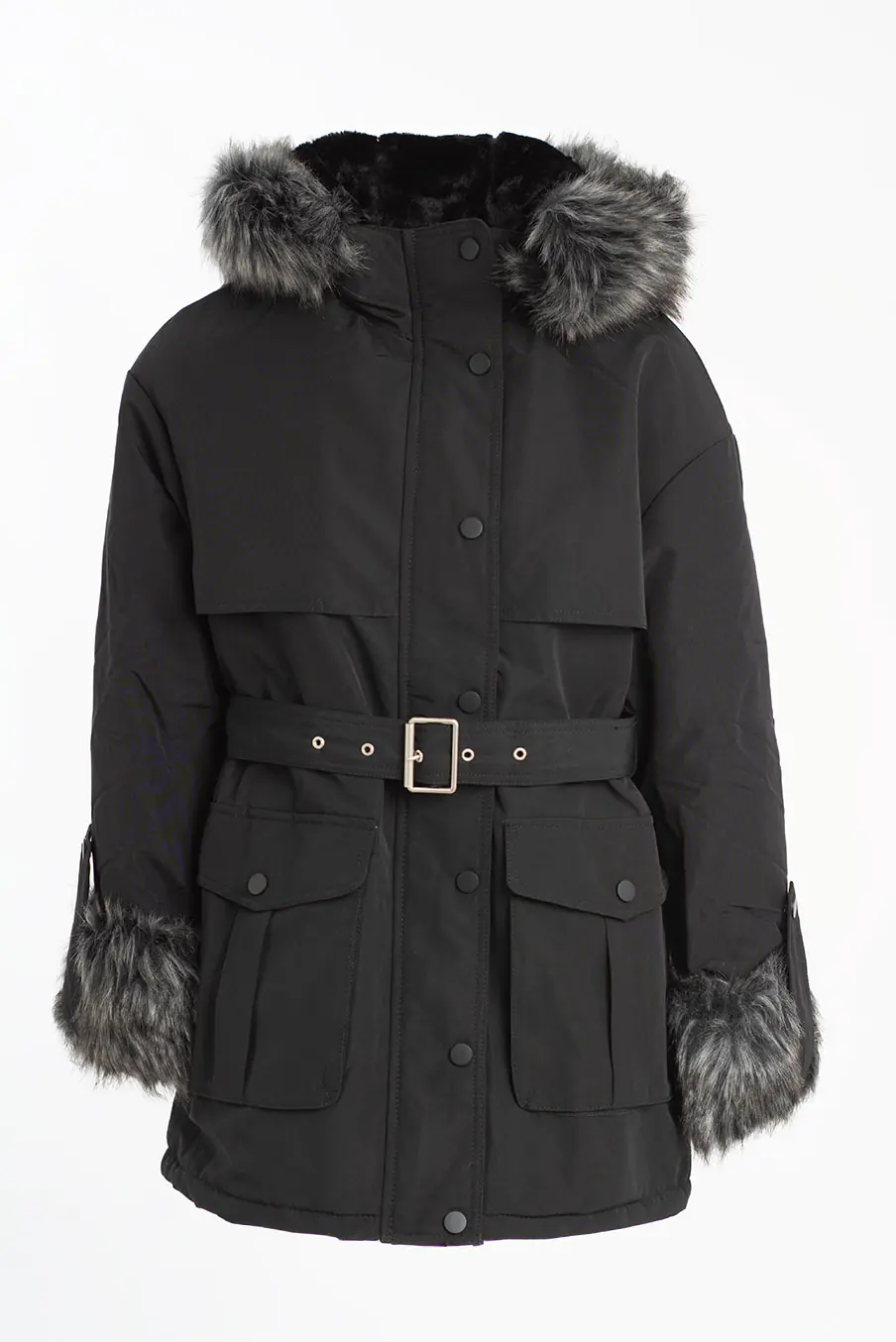 Quispo estilo Parka com pelo inetrio, capuz com pelo removivel e cinto.