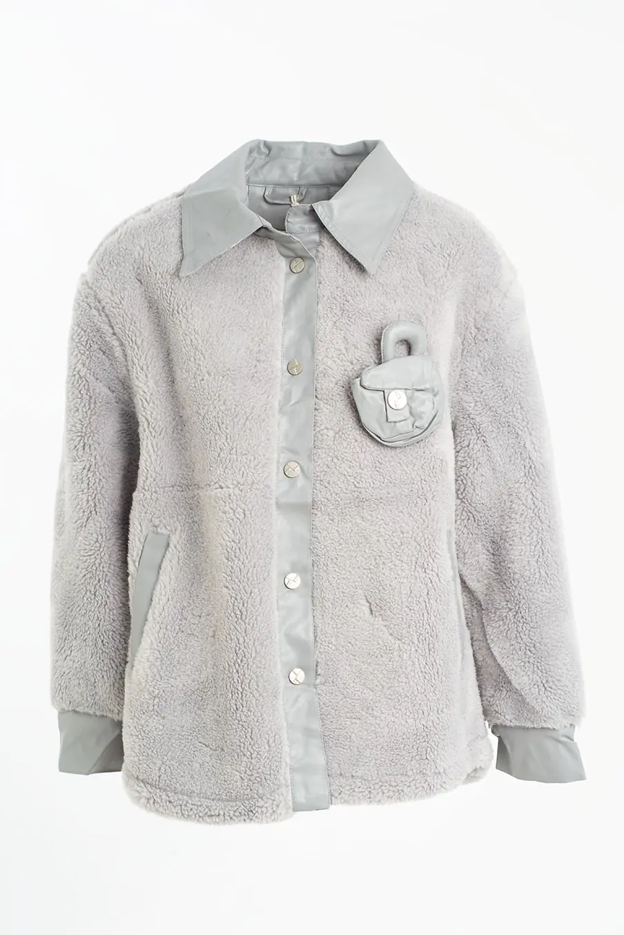 Casaco Teddy com gola e punho em napa, bolso removivel em napa.