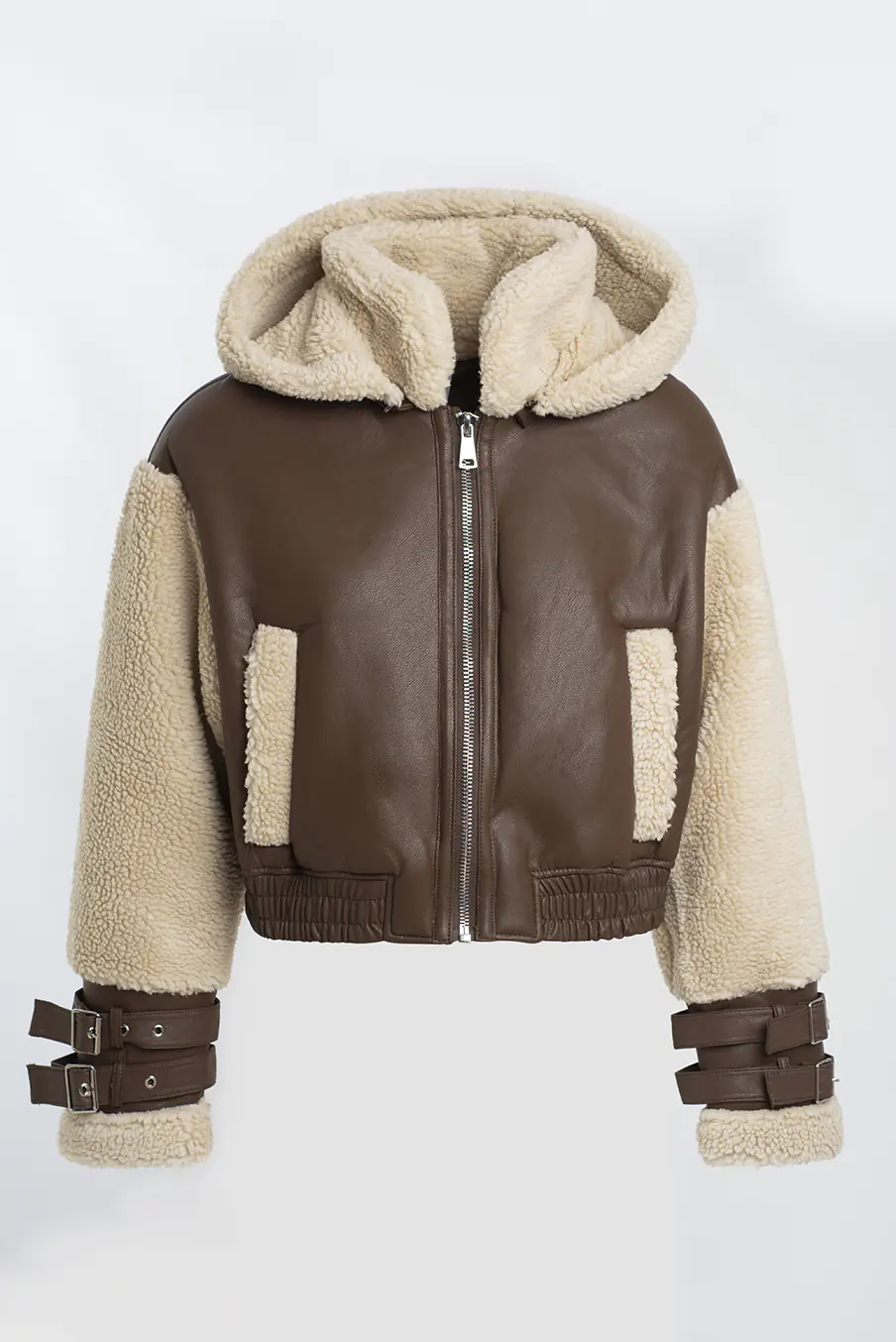 Casaco estilo aviador em napa com pelo de olheva no interio, capuz, bolsos, e detalhe de fivelas no punhos