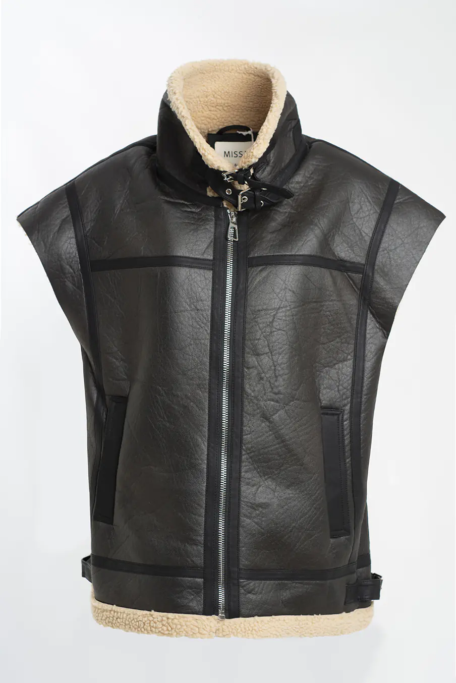 Colete estilo aviador com gola subida interior de pelo e detalhe de fivelas