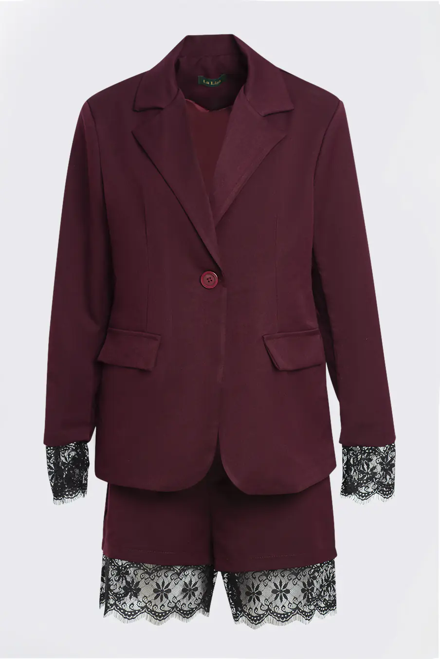Conjunto de blazer mais calçaio, com pormenor em renda nos punho e nos calçoes