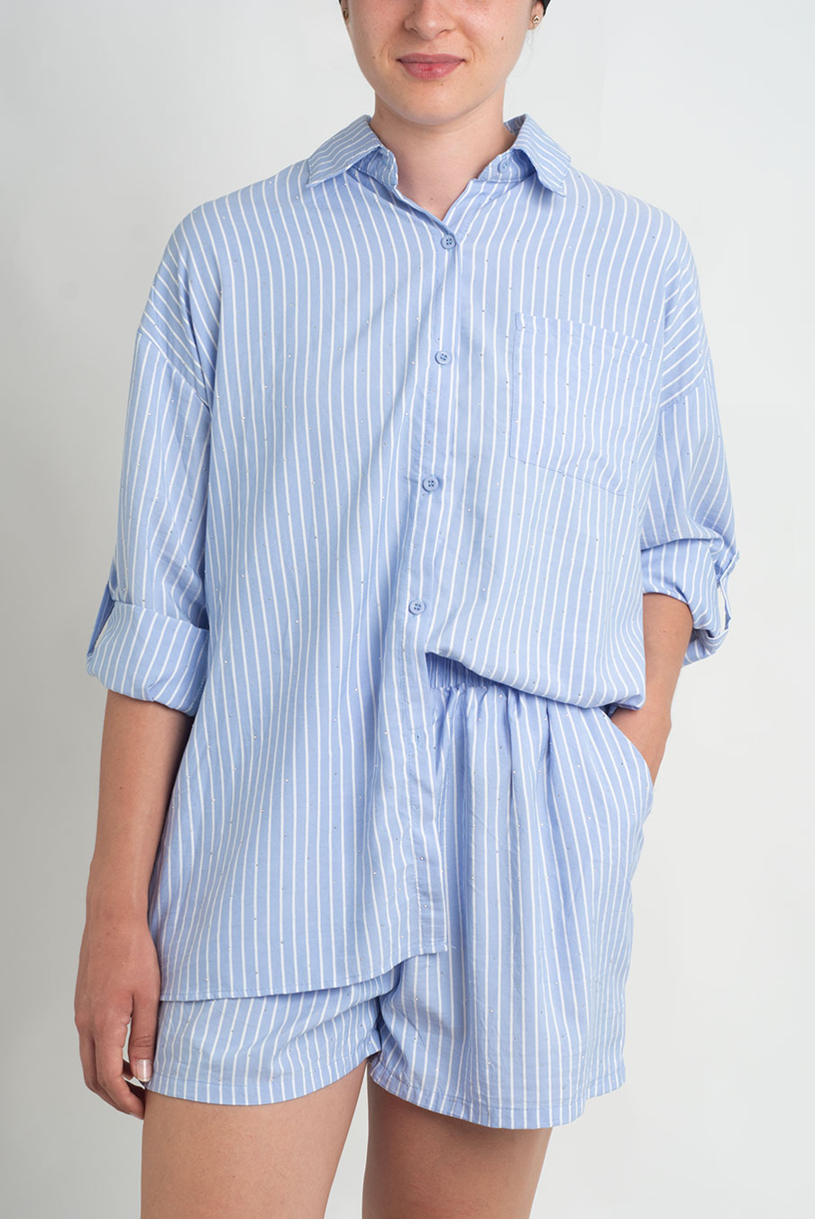 Conjunto composto por calção e camisa as riscas com detalhes brilhantes.