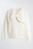 Malha macia com gola laço oversized. Peça divertida e cozy, perfeita para dar cor e estilo aos dias frios.