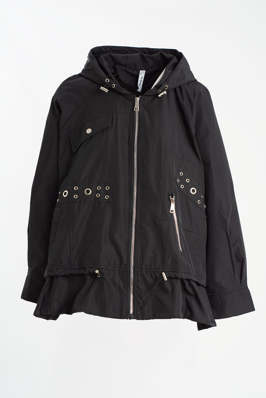 Parka cintada com capuz e argolas metálicas