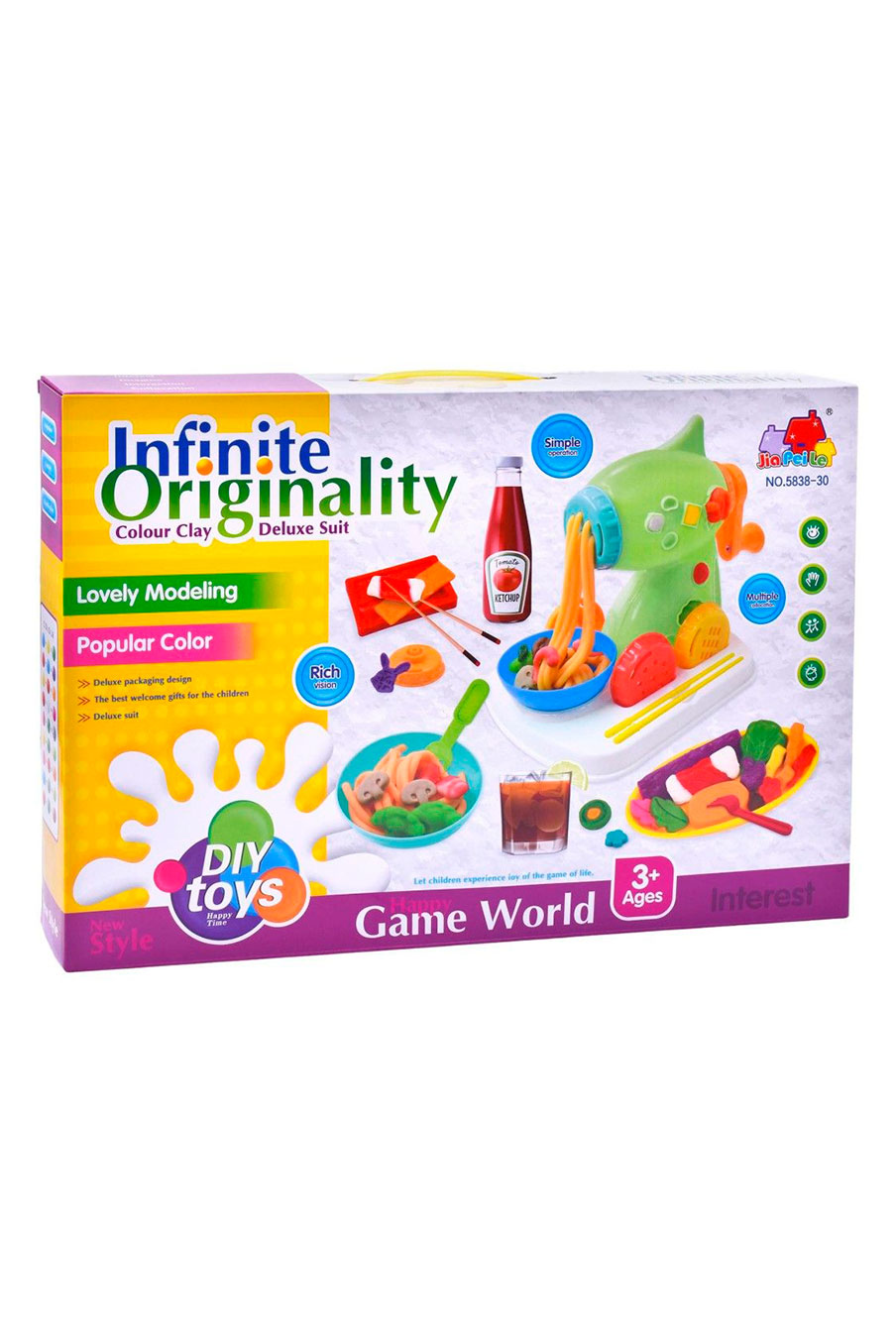 Conjunto Infinite Originality – Colour Clay Deluxe Suit — um kit completo de plasticina colorida para criar refeições divertidas e cheias de imaginação! Inclui máquina de massa, moldes e vários utensílios para modelar pratos criativos.