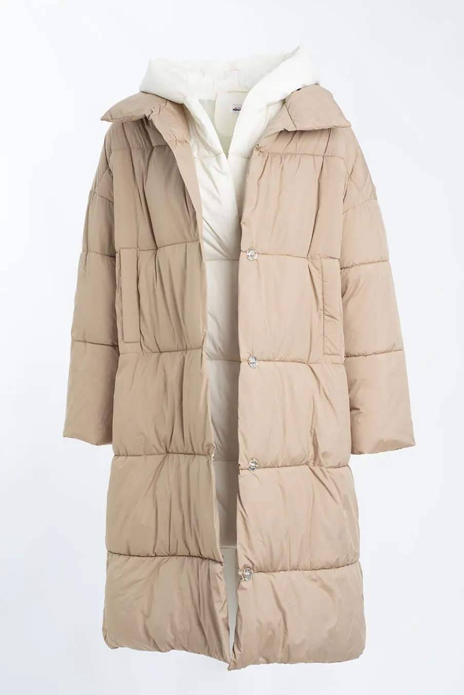 Puffer comprido com capuz integrado e colete interio, tem bolsos e botões