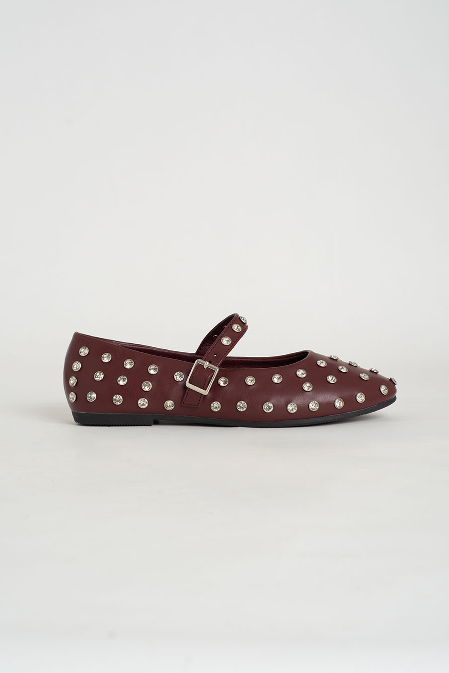 Mary Jane  com tira e fivela no peito do pé. O grande destaque está nos apliques de brilhantes que cobrem todo o modelo, transformando um design clássico num statement cheio de atitude.