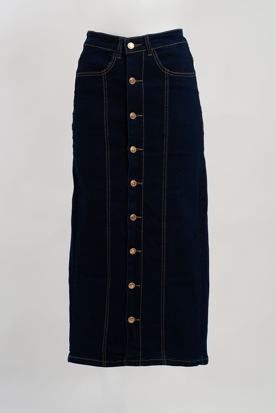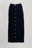 Saia midi em ganga com abotoamento frontal completo. Modelo clássico e feminino, com cintura média e costuras contrastantes que alongam a silhueta. O tecido em ganga elástica garante conforto e liberdade de movimento.