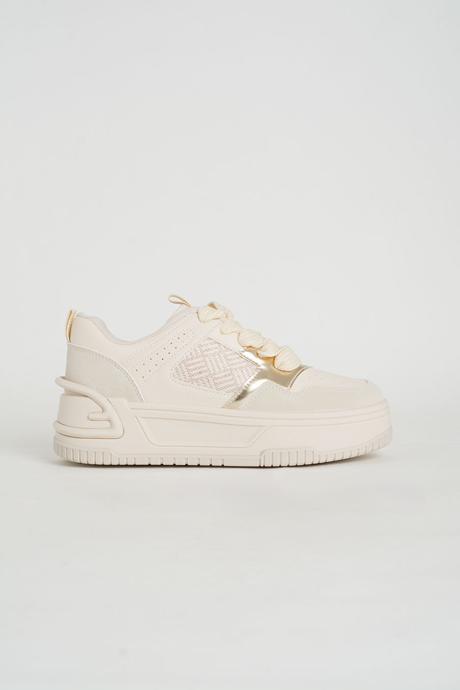 A sola grossa antiderrapante garante estabilidade e conforto, ideal para longas caminhadas ou uso diário. Disponíveis em branco e bege com apontamentos metálicos, são versáteis e fáceis de combinar com qualquer outfit.