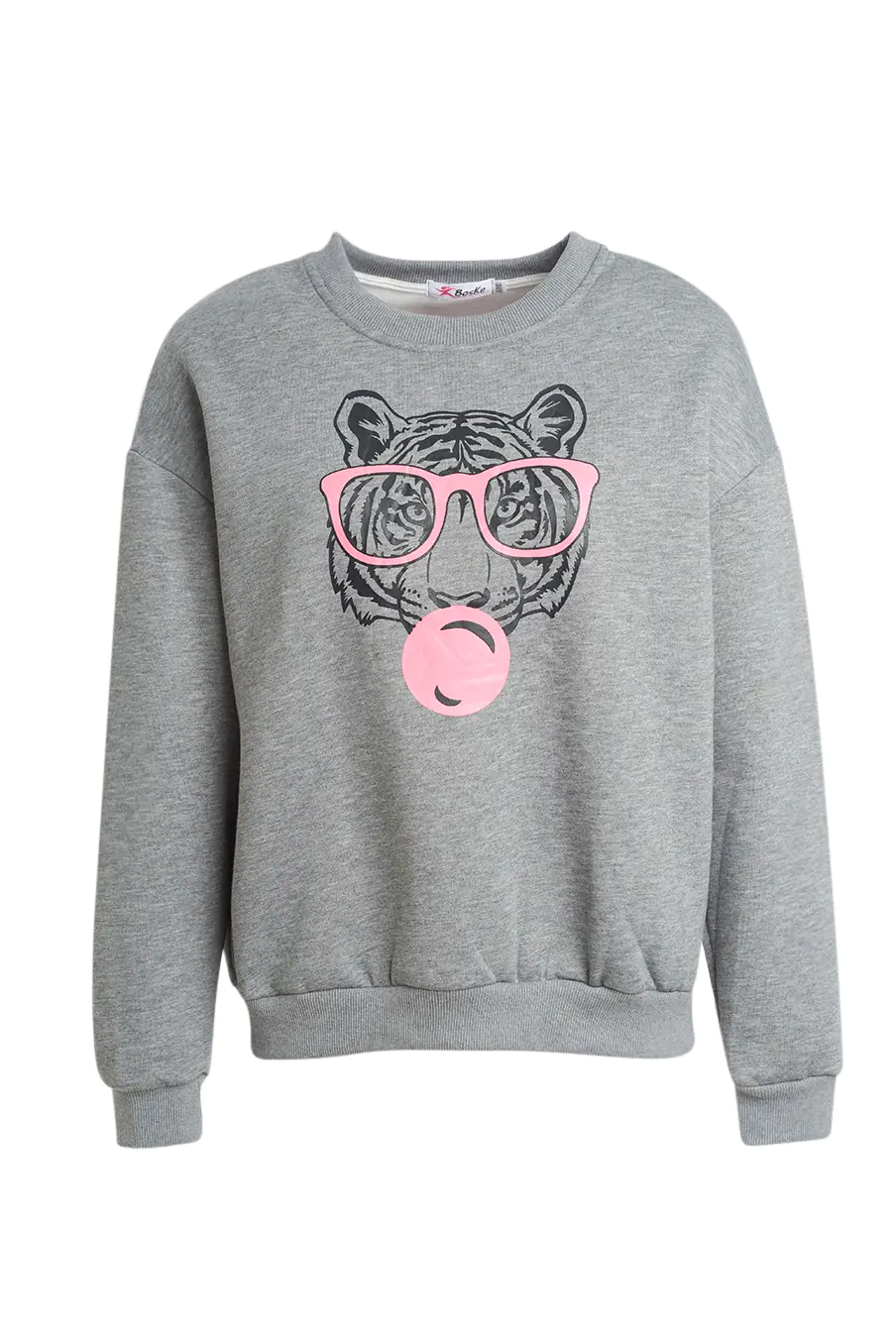 Sweatshirt em algodão macio com estampa divertida de tigre com óculos e pastilha elástica.
