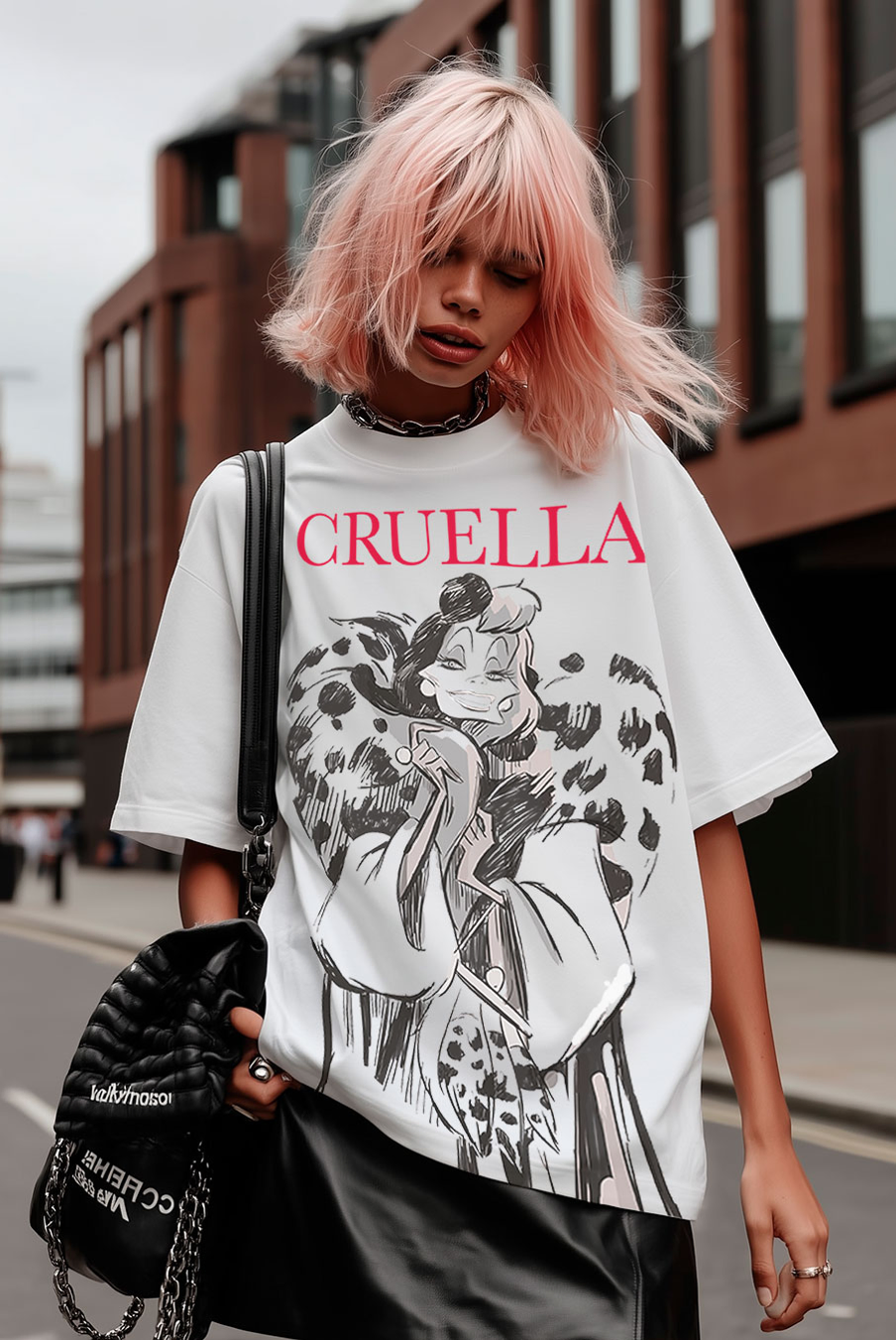 Cruella em modo ícone de moda. Esta t-shirt é para quem adora desafiar as regras com elegância e ousadia.