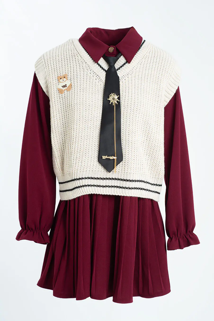 Conjunto vestido estilo colegial, Leve de mangas leves e colete de malha cru e gravata decorativa