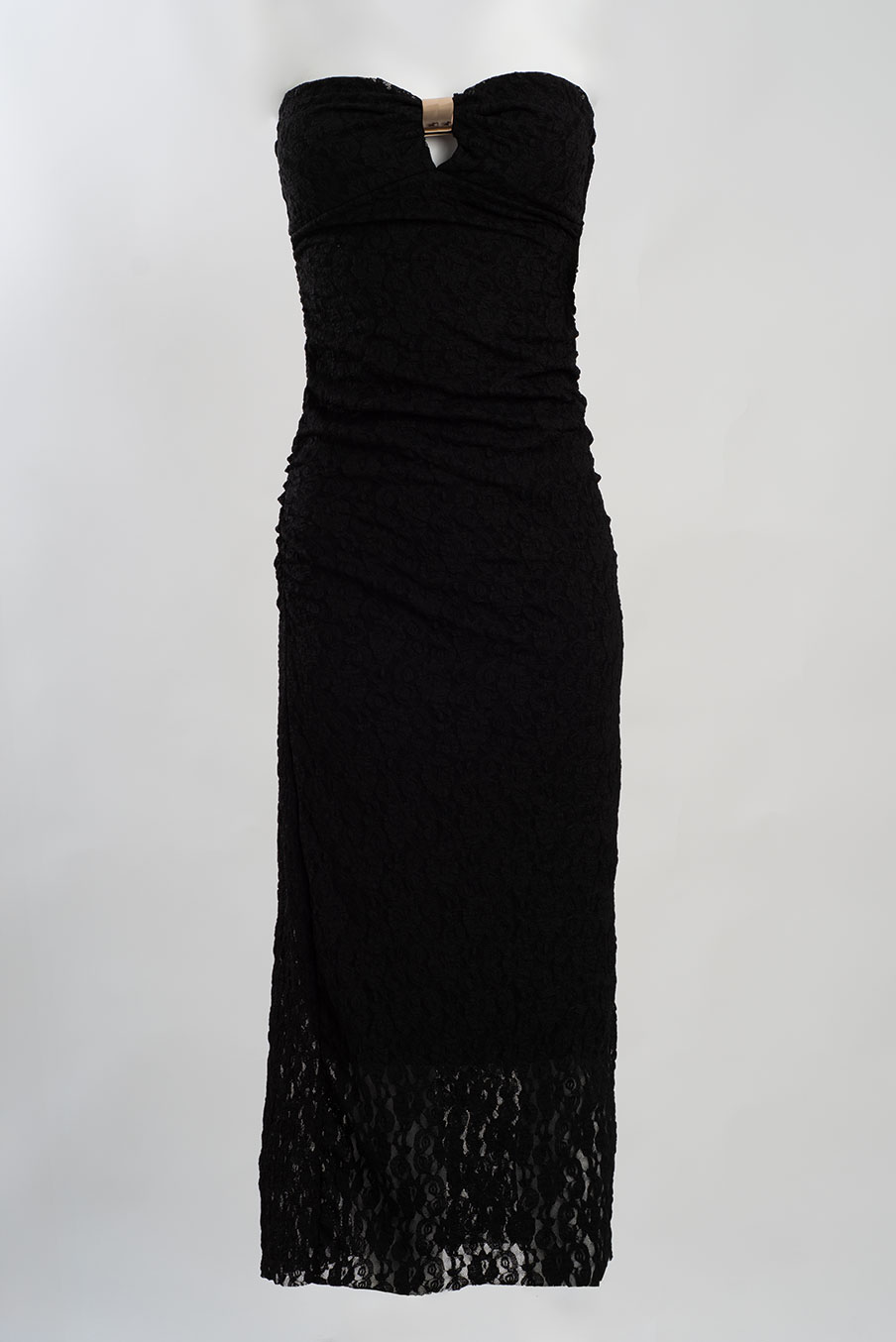 Um clássico intemporal que une elegância e sensualidade. Este vestido em renda destaca-se pelo detalhe com pendente no decote, realçando o peito de forma sofisticada.